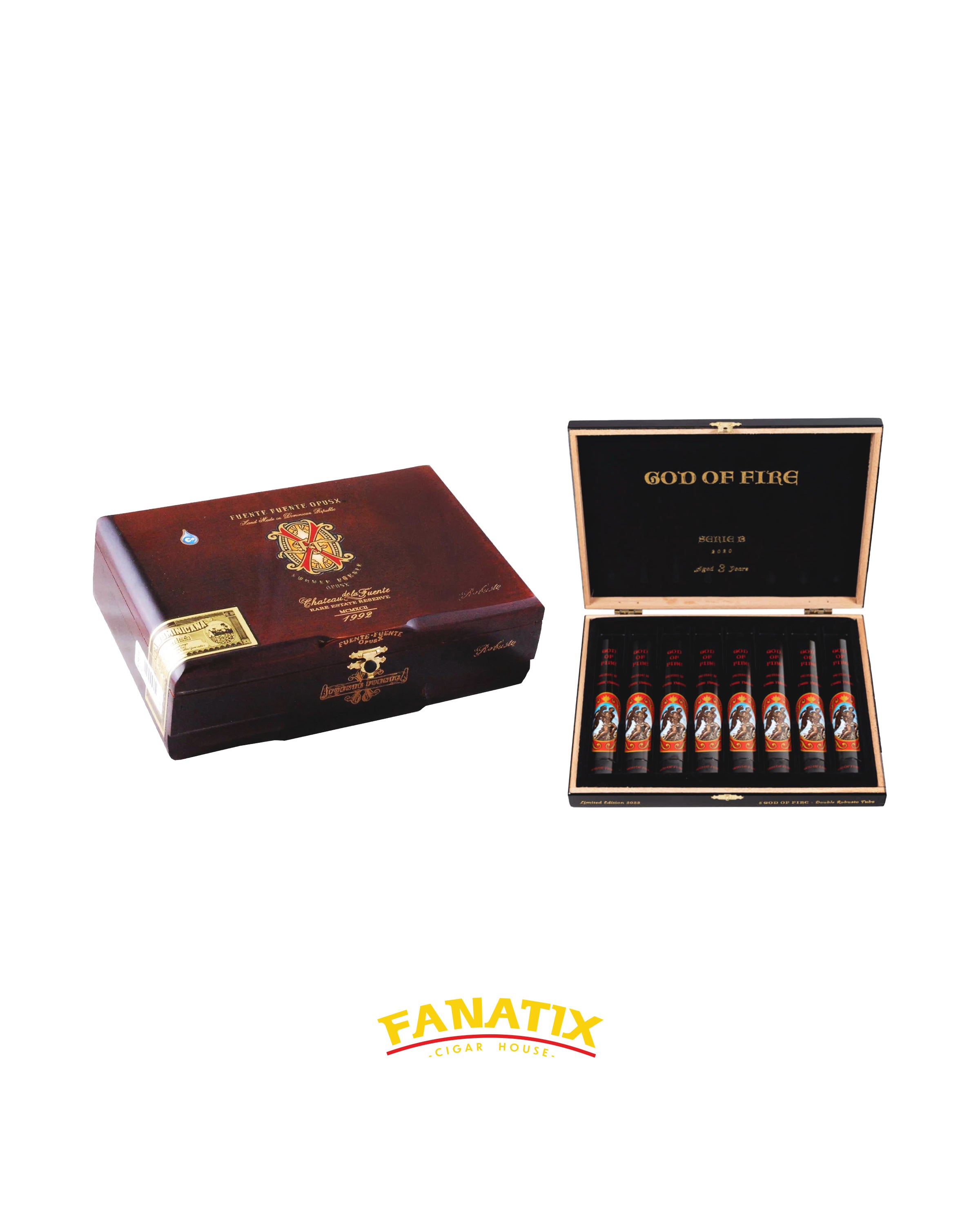 A bold and refined pairing, combining the classic strength of OpusX Robusto with the rich, full-bodied character of God of Fire Serie B in tubo format.